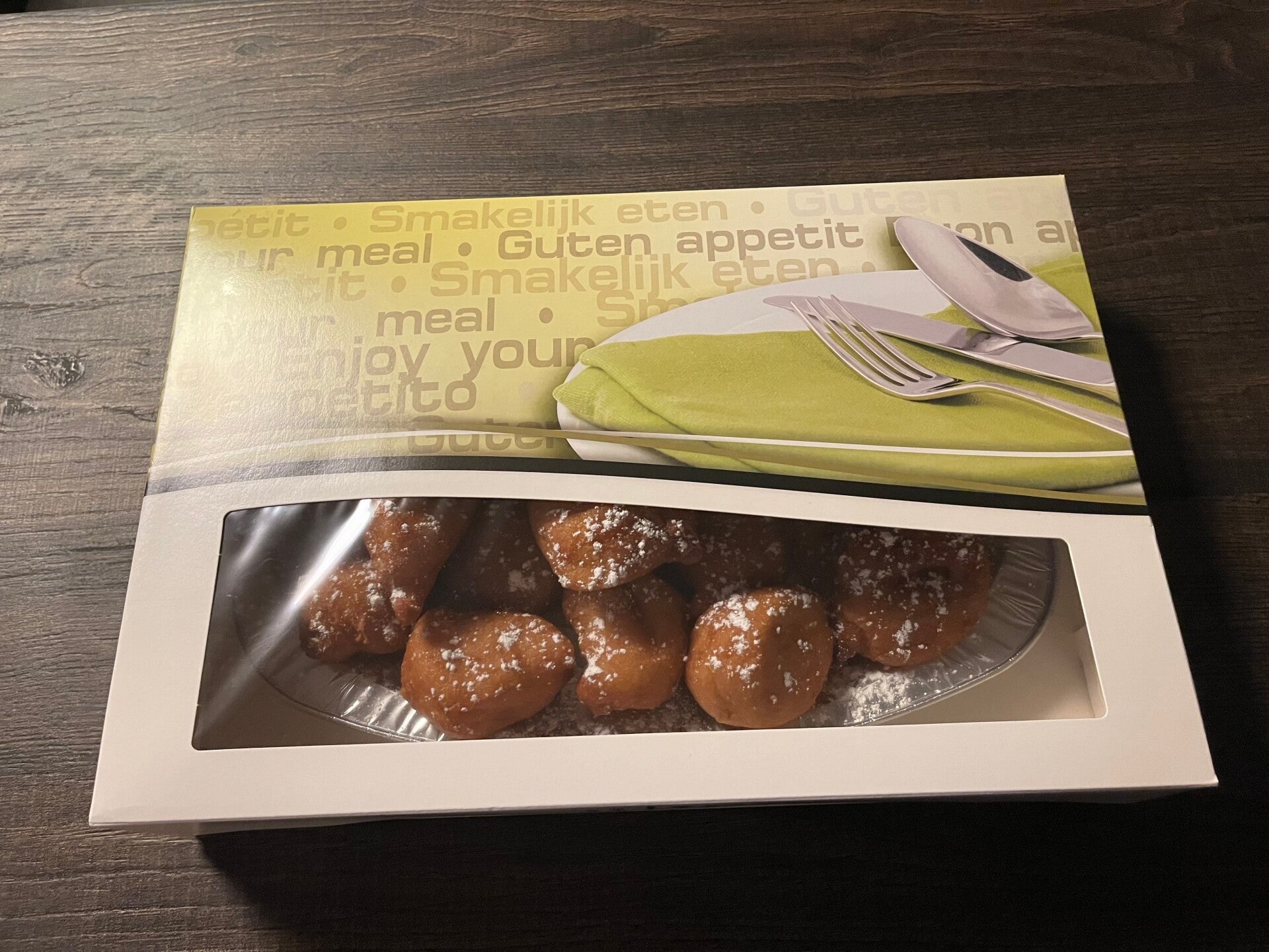 12 oliebollen/ 12 krentenbollen/ 4 appelbeignets op een schaal en geleverd in een doos incl. poedersuiker